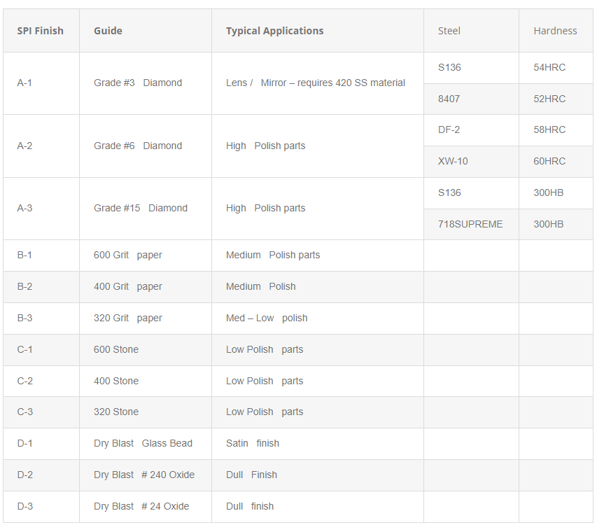The society of plastic industry (SPI) devised industry standards for plastic injection molding finishes, The SPI surface finish standard covers 12 SPI grades of polish finishes split across four categories: glossy (A), semi-glossy (B), matte (C) and textured (D).as outlined below: